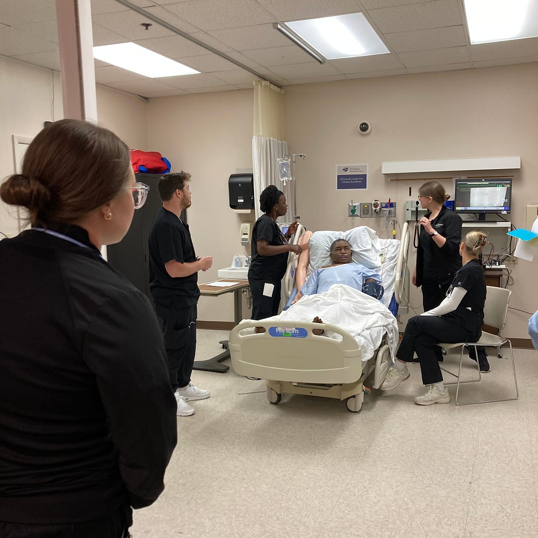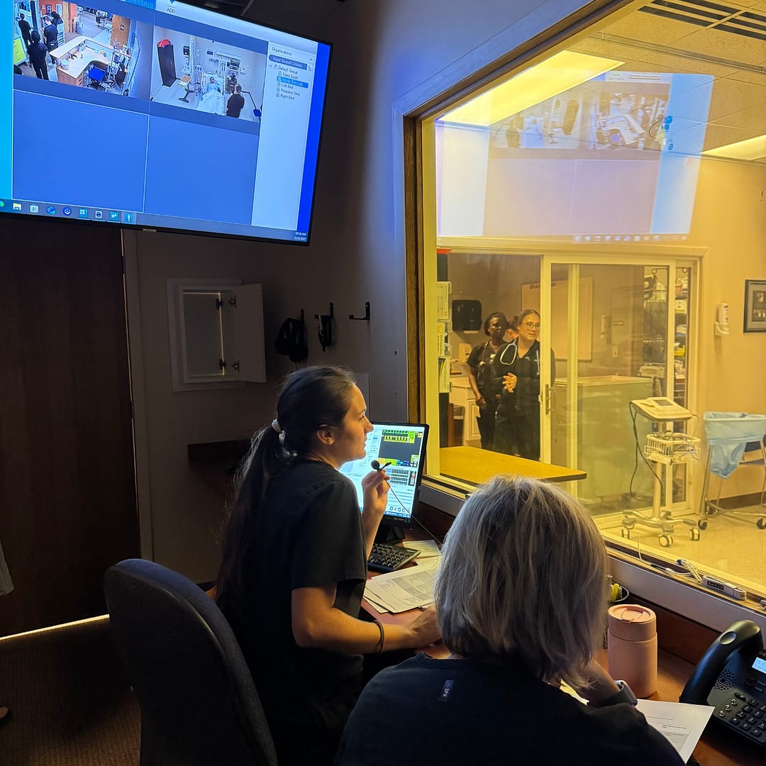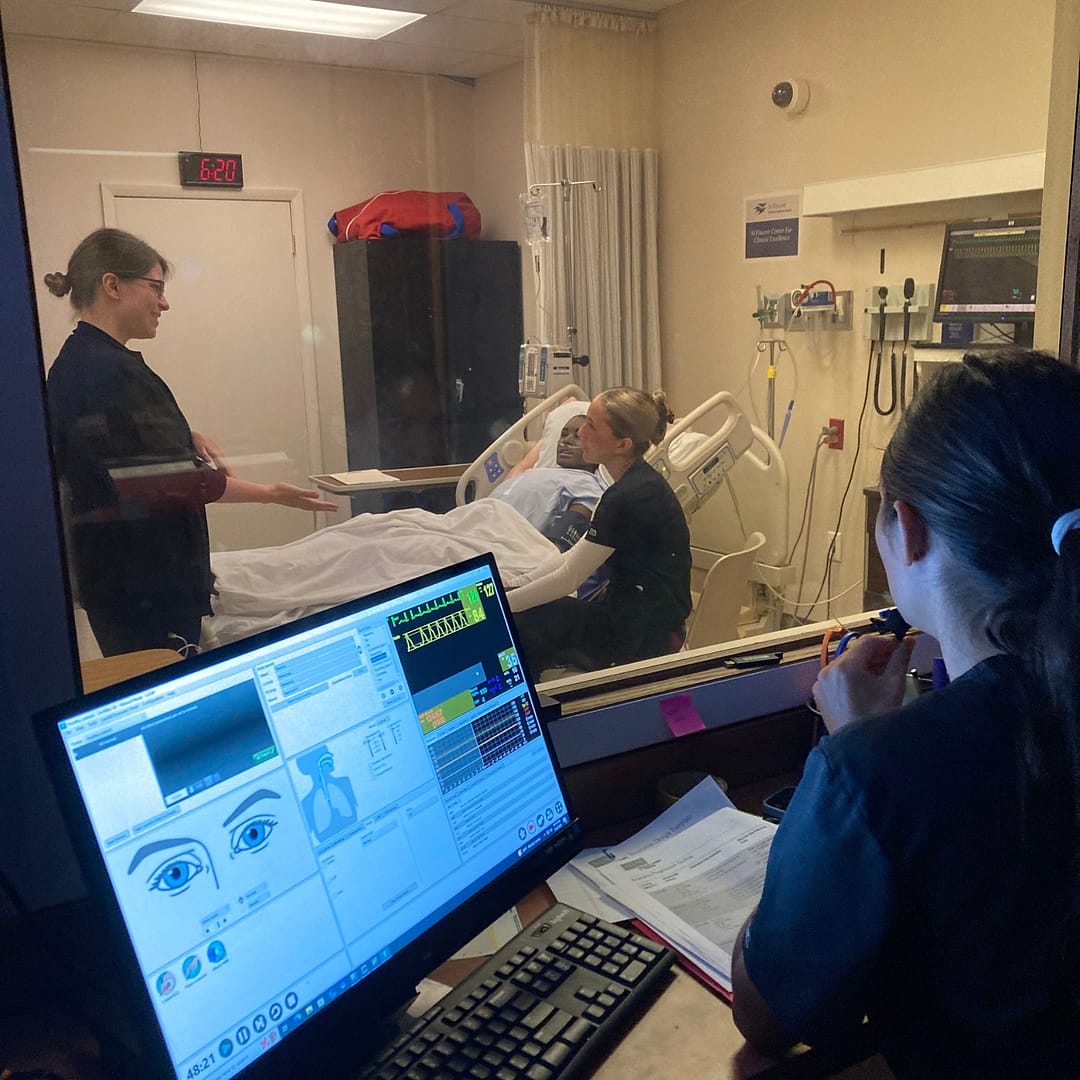 The simulation director, Savannah Laker, watched the situation unfold behind a one-way mirror, taking notes on her students and controlling the SimMan with another nursing faculty. At the end of the simulation, she debriefed with the students, asking about what went well, areas to improve their skills and order of operations, communication, and more. The entire simulation lab experience is hands-on, interactive, and includes mentorship from nursing faculty who have years of experience providing care to patients.